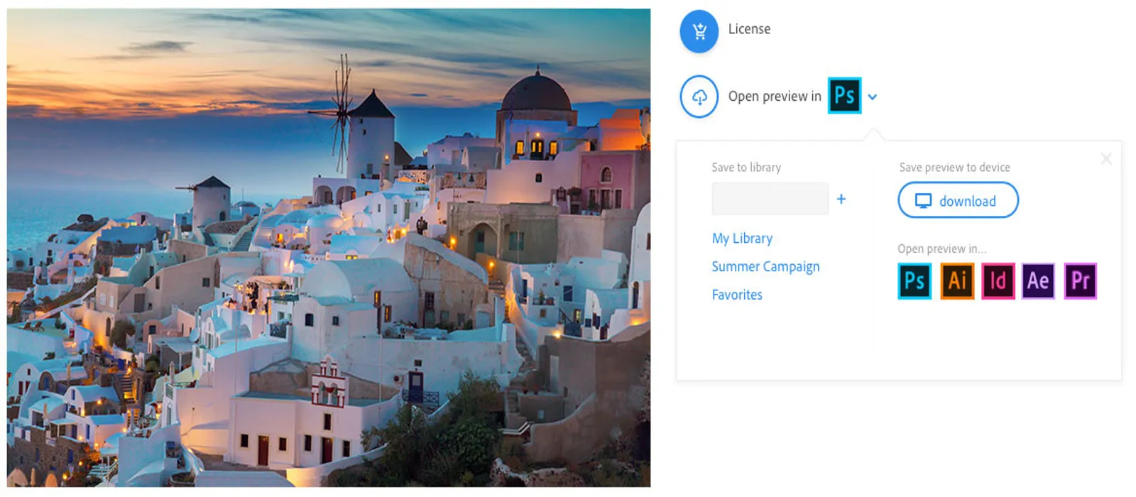 Verwenden Sie in Ihren Designs zur Vorschau zunächst Bilder mit Wasserzeichen. Lizenzierung, Zugriff und Verwaltung sind dann direkt in Photoshop CC, InDesign CC, Illustrator CC oder einer anderen Adobe-Desktop-Applikation möglich.